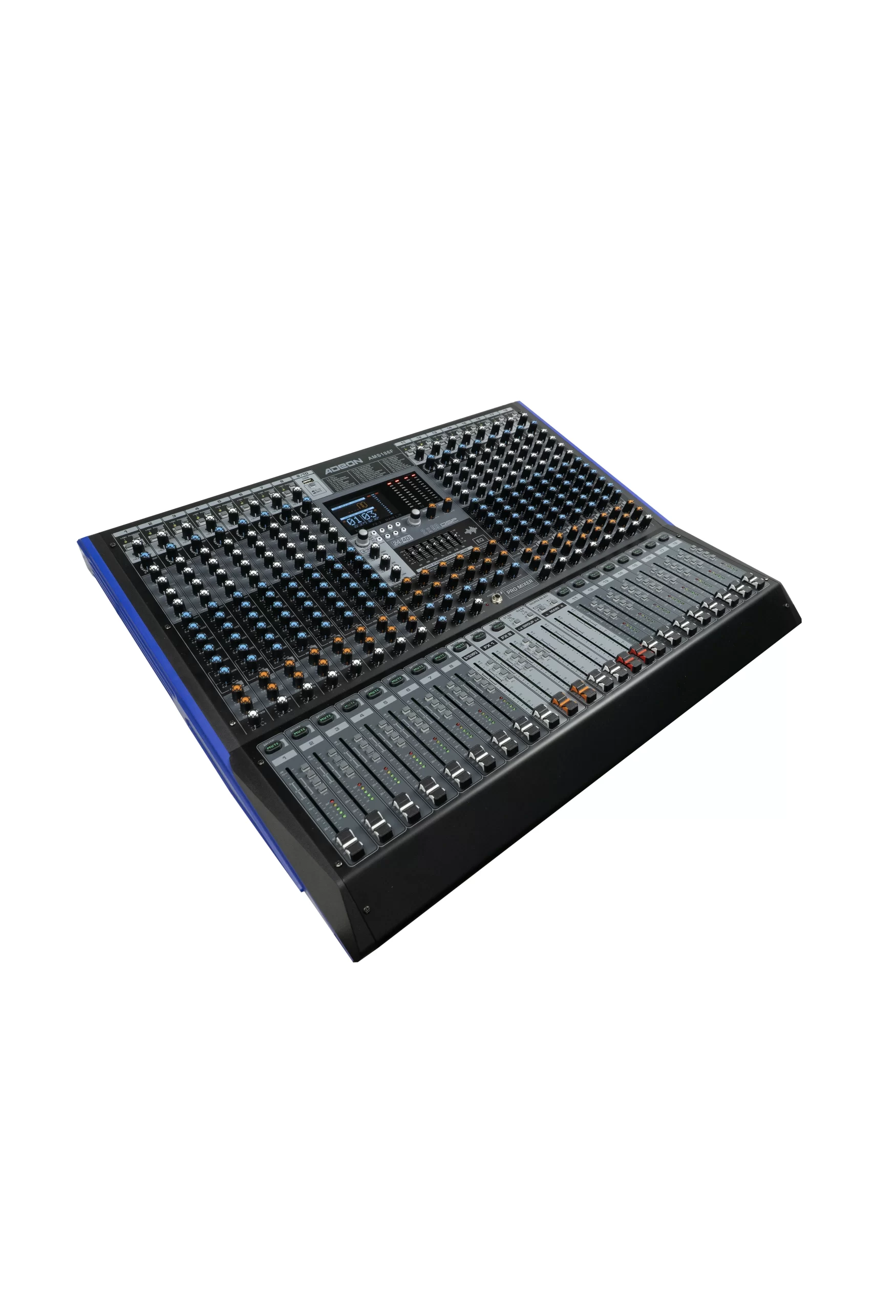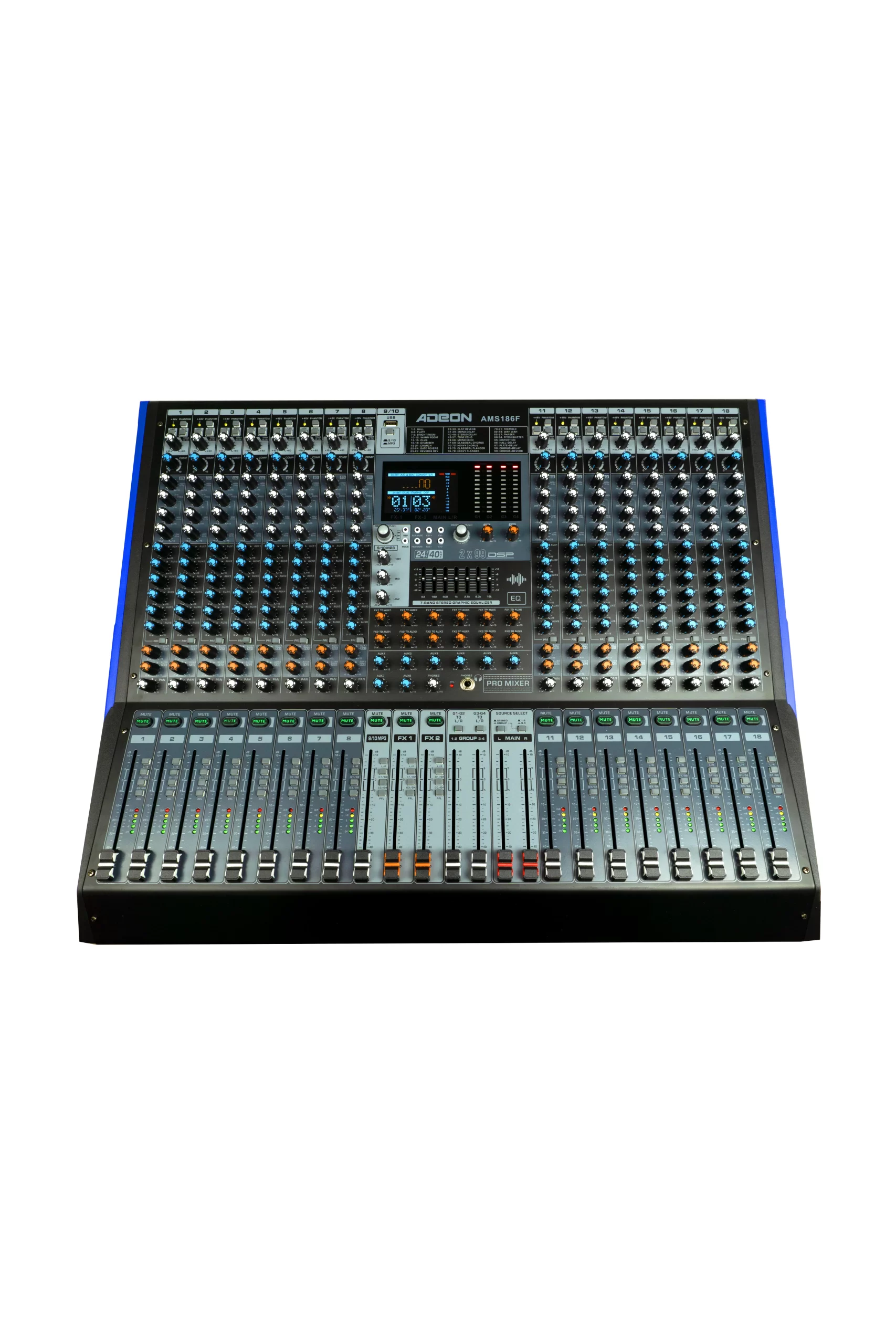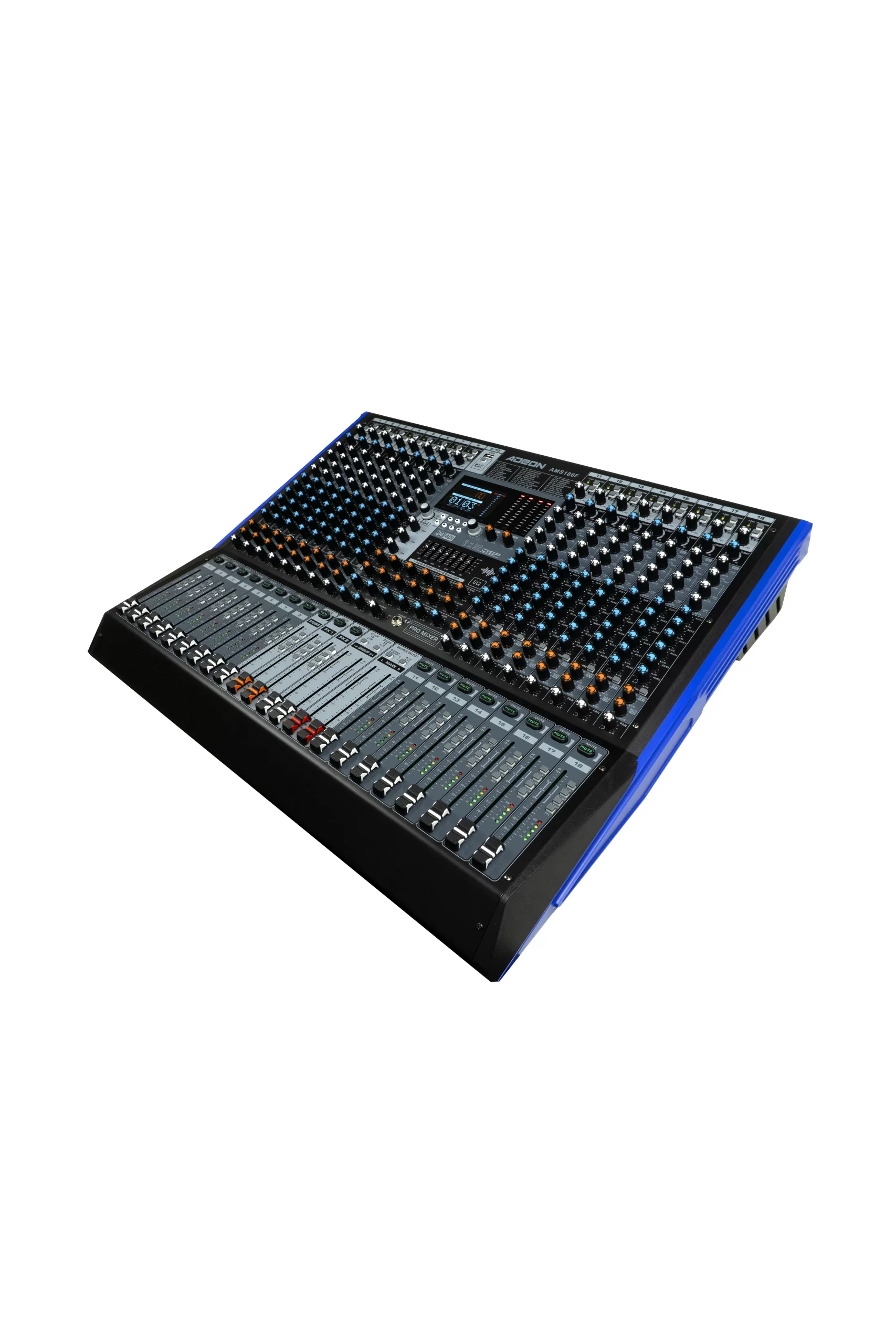 The AMS 186F is a professional-grade audio mixer designed to handle larger and more complex audio setups. It provides a generous number of mono and stereo channels, flexible auxiliary sends, and built-in digital effects. With support for phantom power, graphic EQ, digital playback, and comprehensive monitoring controls, this mixer is suited for live performances, studio mixing, and fixed audio installations needing expanded routing and control.